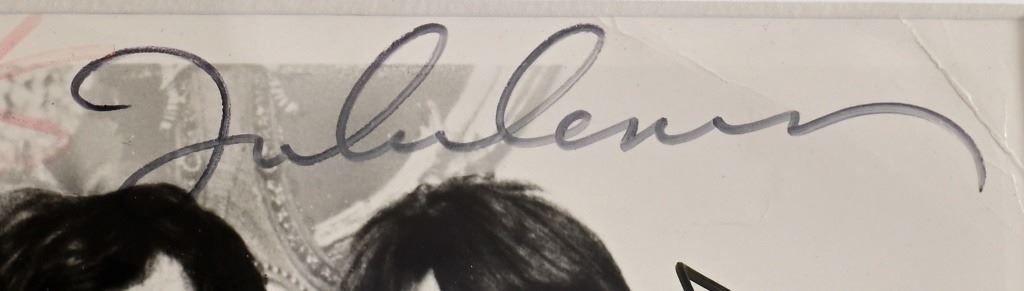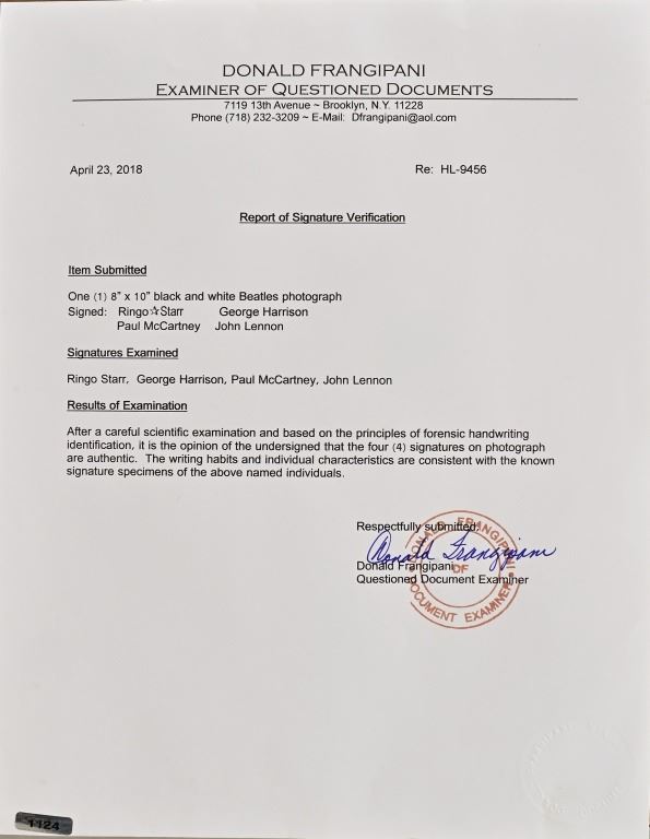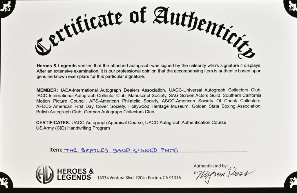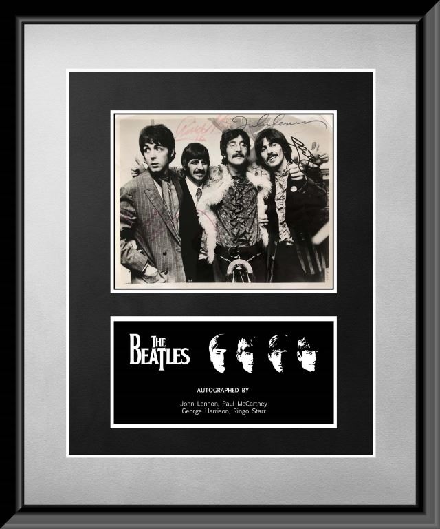 The Beatles band signed photo autographed by John Lennon, Paul McCartney, George Harrison and Ringo Starr. 18x22 inches. Authenticated by Donald Frangipani. PD115