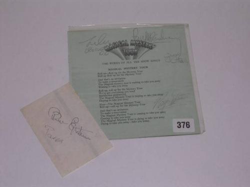 The Beatles & Brian Epstein Autographs, The Beatles individually Signed in pencil on extract from Magical Mystery EP, Epstein's on reverse of ABC TV Ltd Compliments slip