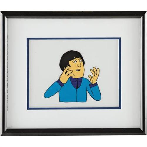 <B>"The Beatles" Cartoon Series Animation Cel.</B></I> The Beatles reportedly did not care for the animated series based on them that aired from 1965-69, and were also less than enthusiastic about the idea of an animated feature film that was in the works, ultimately declining to be involved in the production of <I>Yellow Submarine</B></I> (1968). (However, they changed their minds upon seeing completed footage from the movie, and years after the Beatles broke up, John Lennon admitted that he "got a blast" out of watching reruns of the cartoon series.) This rare animation cel from the series comes from episode #10 ("Long Tall Sally/I'll Cry Instead," November, 1965), and features a medium shot of a cartoon John Lennon. The cel has been matted and framed to an overall size of 18" x 15" and is in Excellent condition. <BR><BR><b>Shipping:</b> Framed - with Glass, Medium (<a target="_blank" href="http://www.heritageauctions.com/common/shipping.php">view shipping information</a>)