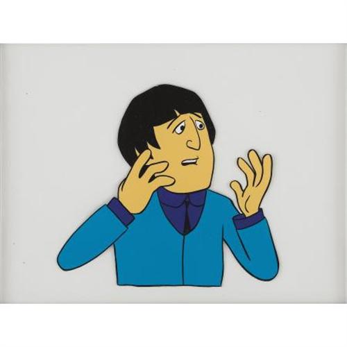 <B><I>The Beatles</B></I></B></I> <B>Cartoon Series Animation Cel.</B></I> The Beatles reportedly did not care for the animated series based on them that aired from 1965-69, and were less than enthusiastic about the idea of an animated feature film, ultimately declining to be involved in the production of <I>Yellow Submarine</B></I> (1968). (However, they changed their minds upon seeing completed footage from the movie, and years after the Beatles broke up, John Lennon admitted that he "got a blast" out of watching reruns of the cartoon series.) This rare animation cel from the series comes from episode #10 ("Long Tall Sally/I'll Cry Instead," November, 1965), and features a medium shot of a cartoon John Lennon. The cel has been matted and framed to an overall size of 18" x 15" and is in Excellent condition.<BR><BR><b>Shipping:</b> Framed - with Glass, Medium (<a target="_blank" href="http://www.heritageauctions.com/common/shipping.php">view shipping information</a>)