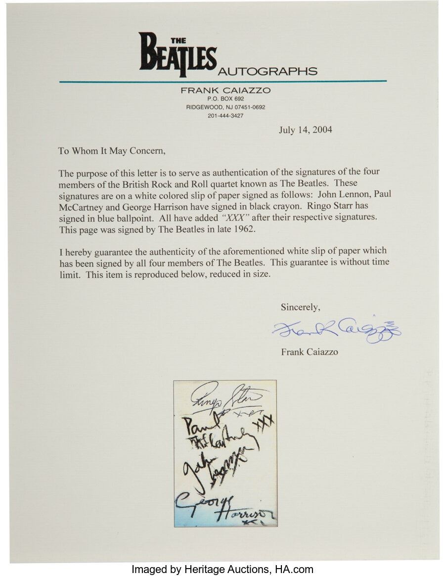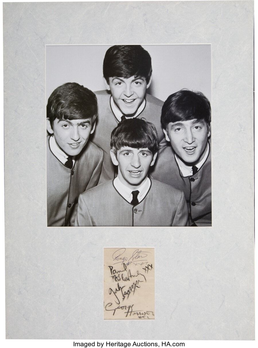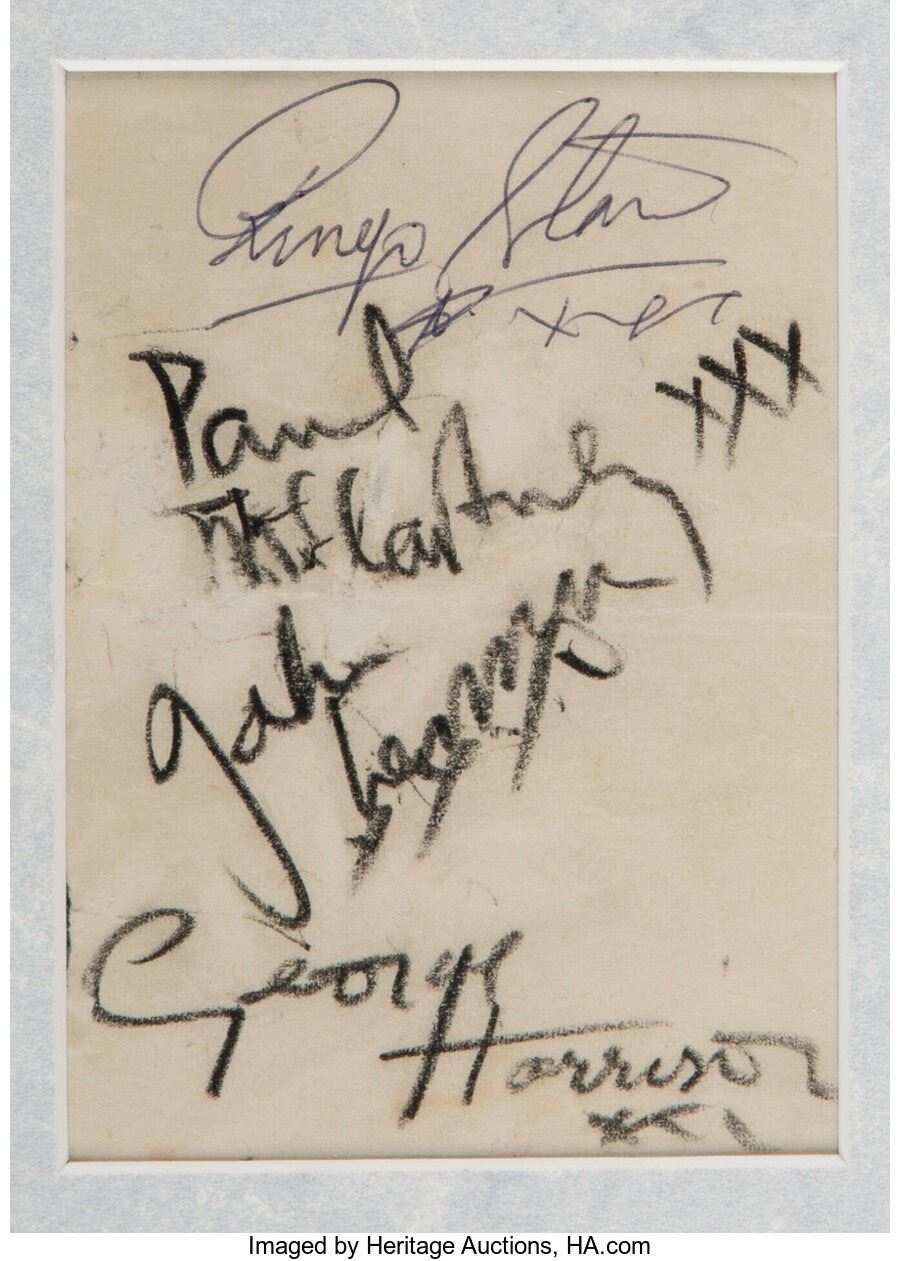 The Beatles Complete Set of Early Autographs (1962).There is cool and then there is COOL! A white colored slip of paper signed by John Lennon, Paul McCartney, and George Harrison in black crayon. Ringo Starr has signed in blue ballpoint pen. Paper in mat measures approx: 3 1/4" by 4 1/2". The black and white photo measures in mat approx: 10" by 11". The mat measures approx: 14 3/4" by 20". The Fabs signed this in 1962, the year Ringo Starr officially joined the group.