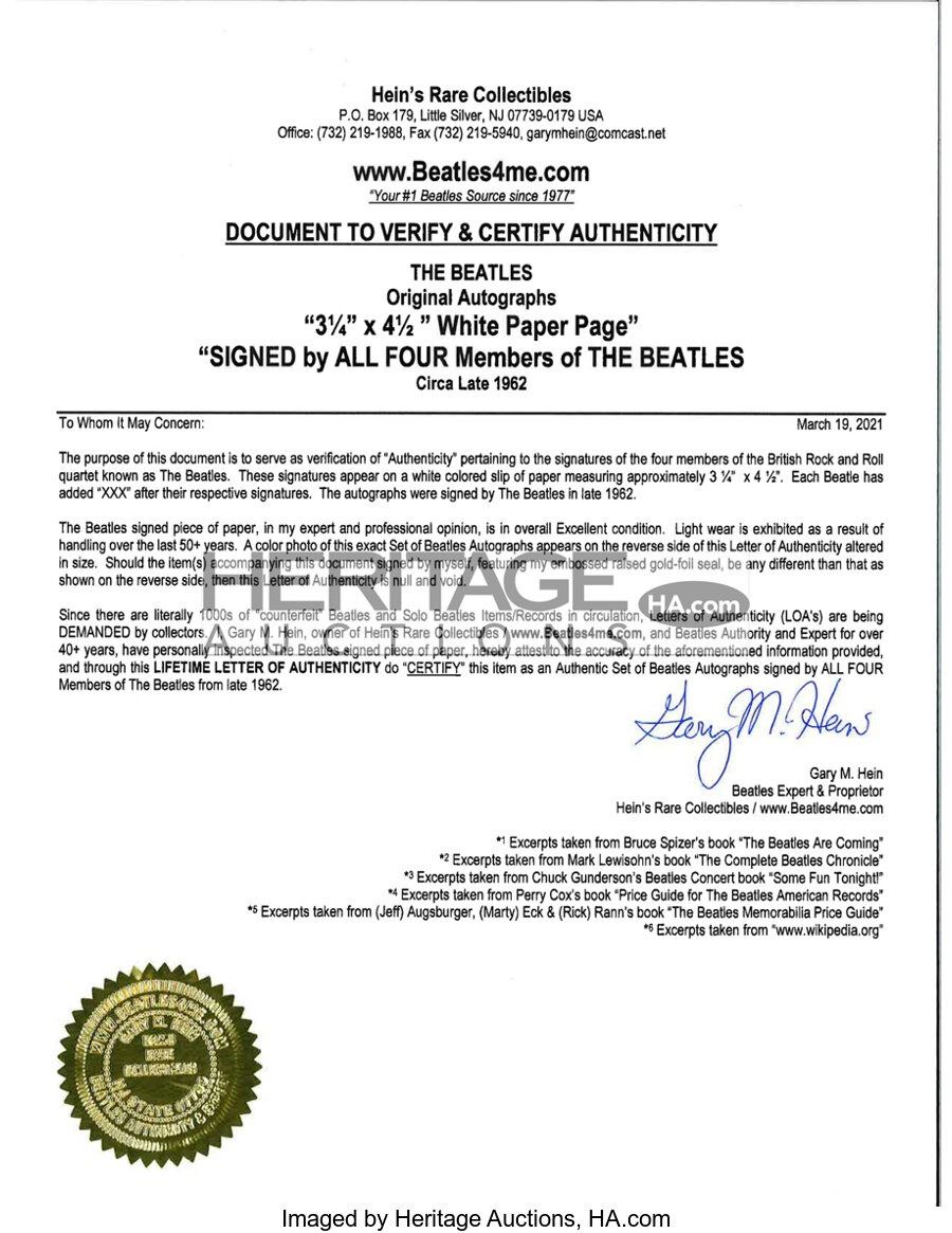 We cannot stress enough the rarity of this example. Also included is a LOA from Beatles expert Frank Caiazzo. A wonderful investment piece that you can enjoy for years to come. LOA from Beatles Expert Gary Hein of Hein's Rare Collectibles. COA from Heritage Auctions.