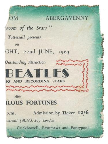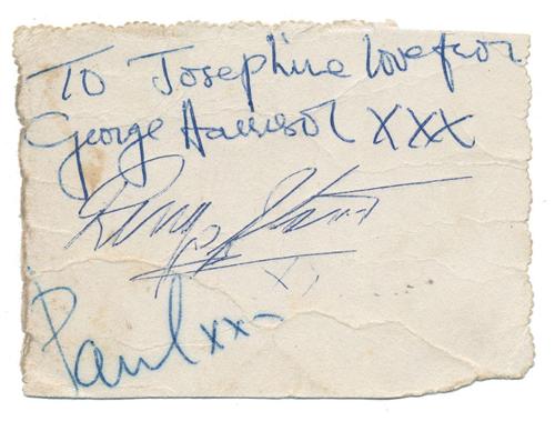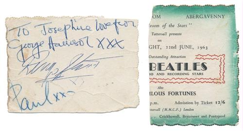 An admission ticket stub for a performance The Beatles did on June 22, 1963 in Abergavenny which has been signed on the reverse by George Harrison, Ringo Starr and Paul McCartney. George has added “To Josephine love from” before his signature. Paul has signed in first name only and all have added “X’s”. Beatles signed concert tickets in any form are scarce. This stub has been split into two, with the front and back halves now separated, each measuring 3 x 3.5”. Light staining and creases.