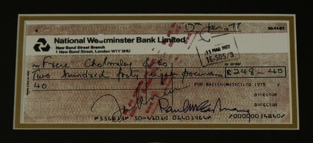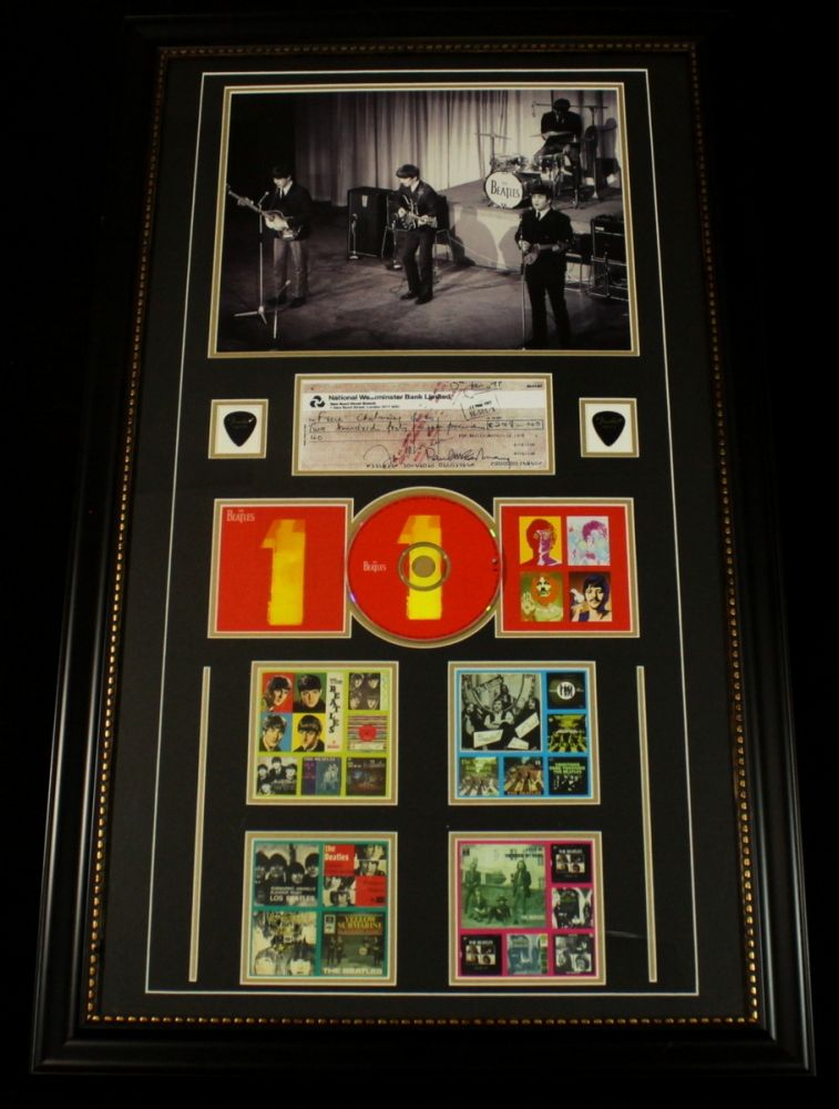 Custom frame measures 21x35 in size and contains a copy of a check that had been signed by John Lennon and Paul McCartney. This piece is not actually signed. Check copy has been custom framed with two guitar picks, a Beatles CD and a photo of John Lennon, Paul McCartney, Ringo Starr and George Harrison. Please see photo for details.