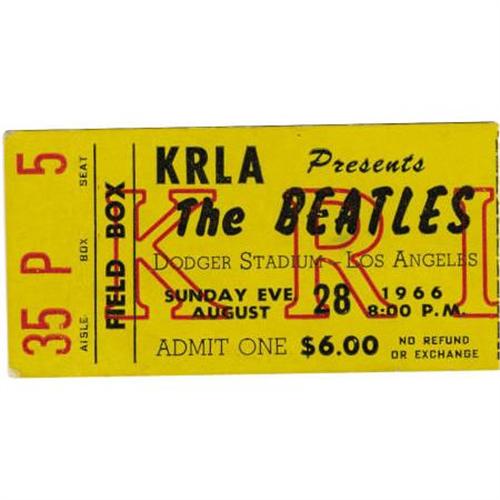 <B>The Beatles Dodger Stadium Concert Ticket Stub (1966).</B></I> An original concert ticket stub for The Beatles' penultimate concert appearance on August 28, 1966 at Dodger Stadium in Los Angeles. The show was attended by 45,000 screaming fans, dozens of whom were hurt when they rushed the main gate as the Beatles tried to leave the stadium in their limousine. (The band eventually made their escape from the opposite side of the stadium in an armored car.) They performed their final concert on the following day at Candlestick Park. This uncommon yellow field box ticket is in Very Fine with very mild edge and corner wear.<BR><BR><b>Shipping:</b> Flat Material, Small (<a target="_blank" href="http://www.heritageauctions.com/common/shipping.php">view shipping information</a>)