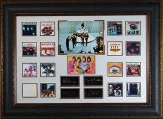 The Beatles custom premium framed unautographed Signature Engraved oversize 27x37 piece. ENGRAVED SIGNATURE DISPLAY - featuring the engraved signatures of all four members of the band Paul McCartney, Ringo Starr, John Lennon, and George Harrison custom framed with miniature images of their album covers.
