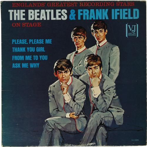 <B>"The Beatles & Frank Ifield On Stage" Portrait Cover Mono LP Vee-Jay 1085 (1964).</B></I> Just four Beatles songs on this 12-song album, and two had already appeared on "Introducing the Beatles", but the album, which was originally issued with another cover, is one of the most sought-after by avid Beatles aficionados. Not as rare as the stereo version; still, only serious bidders need apply! Other than a split seam at bottom center, the cover is nice. The record is is great shape. Condition: VG-EX 6 / EX 7.