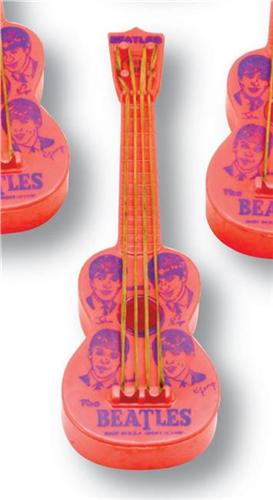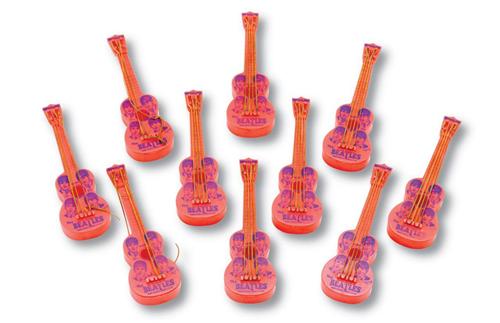 1964. Neat-o lot of ten mini guitars that are replicas of the larger Mastro versions in the same color and plastic! Each one is 5” long and has great graphics! There is a tab/hook on back to hang these from your sweater, collar or shirt pocket. NM. Unused. Some of the rubber band strings have deteriorated over the years.