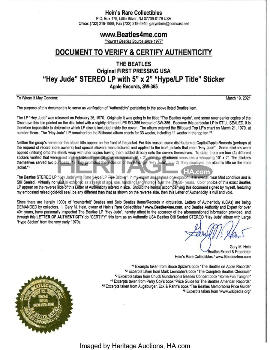 Neither the groups name nor the album title appear on front of the jacket. For this reason some distributers had special stickers made and applied to the front that read "Hey Jude." The small hype sticker version #1 measures: 2" by 5" with nice color. This is a pristine still sealed copy with minor ring wear featuring the very rare small hype sticker. NOTE: The faint ring wear is mainly on the shrink wrap itself; there is little on the sticker. We can't stress enough how rare it is to find this original first pressing USA example. This is a cornerstone piece for the collection and will display well. Condition: NM 9/ GM-MT 10 (still sealed). LOA from Beatles Expert Gary Hein of Hein's Rare Collectibles. COA from Heritage Auctions.