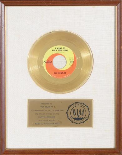 1970’s. The plaque on this white matte style award reads: “Presented To The Beatles To Commemorate The Sale Of More Than One Million Copies Of The Capitol Records Pop Single Record ‘I Want To Hold Your Hand’”. The first Beatles single release on Capitol Records was certified gold four days before the group made their first triumphant trip to the U.S. on February 7th, 1964; thus fulfilling Brian Epstein’s plan of not going to America until the Beatles had a #1 record. “I Want To Hold Your Hand” not only made it to #1, it stayed there for 7 weeks and sold more than five million copies in the U.S. and fifteen million worldwide. The formatting of this award suggests it dates from the 1970’s, even though it possesses an original mid-1960’s matte. The engraved plaque exhibits some surface blemishes/discoloration. The New York Picture and Frame sticker is on the reverse of the 13.25 x 17.25” frame.