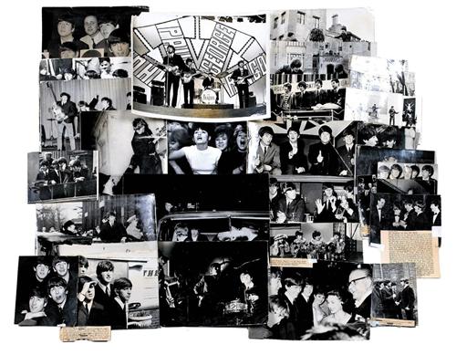 1963-64. Highlights (and there were many) of the first year of British Beatlemania are documented in this collection of photos that were seen in newspapers and magazines throughout the world. Included here are appearances from November ‘63 to July ‘64 including: Royal Command Performance (3), Juke Box Jury, Around The Beatles (3), A Hard Day’s Night filming and Liverpool premiere (9), Night of 100 Stars, Carl-Alan Awards, Prince of Wales Theatre, Variety Club luncheon, Blackpool Night Out, Dromiland Castle in Ireland (2), and Blackpool Night Out (2). An additional four group photos and an original print that was used as the cover of Sam Leach’s “The Birth Of The Beatles” complete the collection. 3.25 x 4.25” up to 8 x 10”, most with attached captions and several with new service photo stamps on reverse.