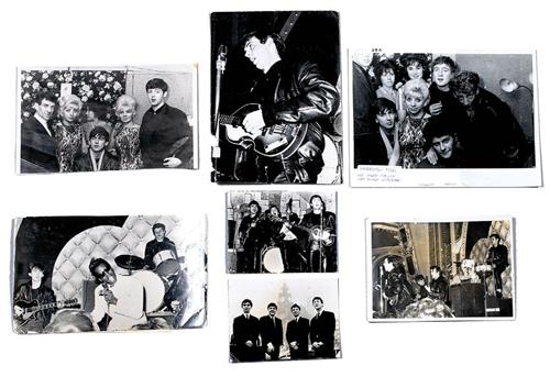 1963-64. Highlights (and there were many) of the first year of British Beatlemania are documented in this collection of photos that were seen in newspapers and magazines throughout the world. Included here are appearances from November ‘63 to July ‘64 including: Royal Command Performance (3), Juke Box Jury, Around The Beatles (3), A Hard Day’s Night filming and Liverpool premiere (9), Night of 100 Stars, Carl-Alan Awards, Prince of Wales Theatre, Variety Club luncheon, Blackpool Night Out, Dromiland Castle in Ireland (2), and Blackpool Night Out (2). An additional four group photos and an original print that was used as the cover of Sam Leach’s “The Birth Of The Beatles” complete the collection. 3.25 x 4.25” up to 8 x 10”, most with attached captions and several with new service photo stamps on reverse.