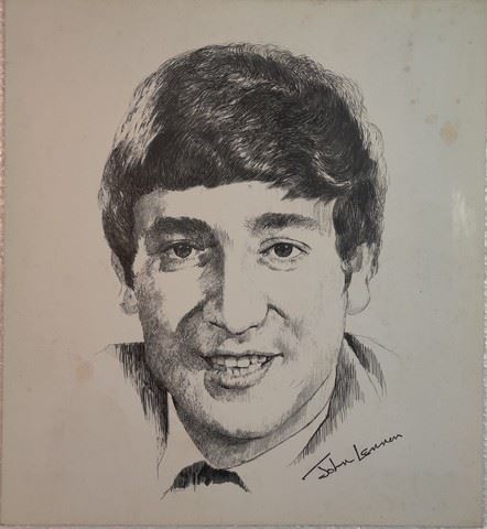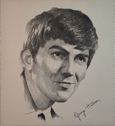 The Beatles (John Lennon, Paul McCartney, George Harrison, Ring Starr) pencil sketches with each member's name signed on their respective photo. Minor edge wear, minor creases, some stains. Excellent. (11.25"x12.25")