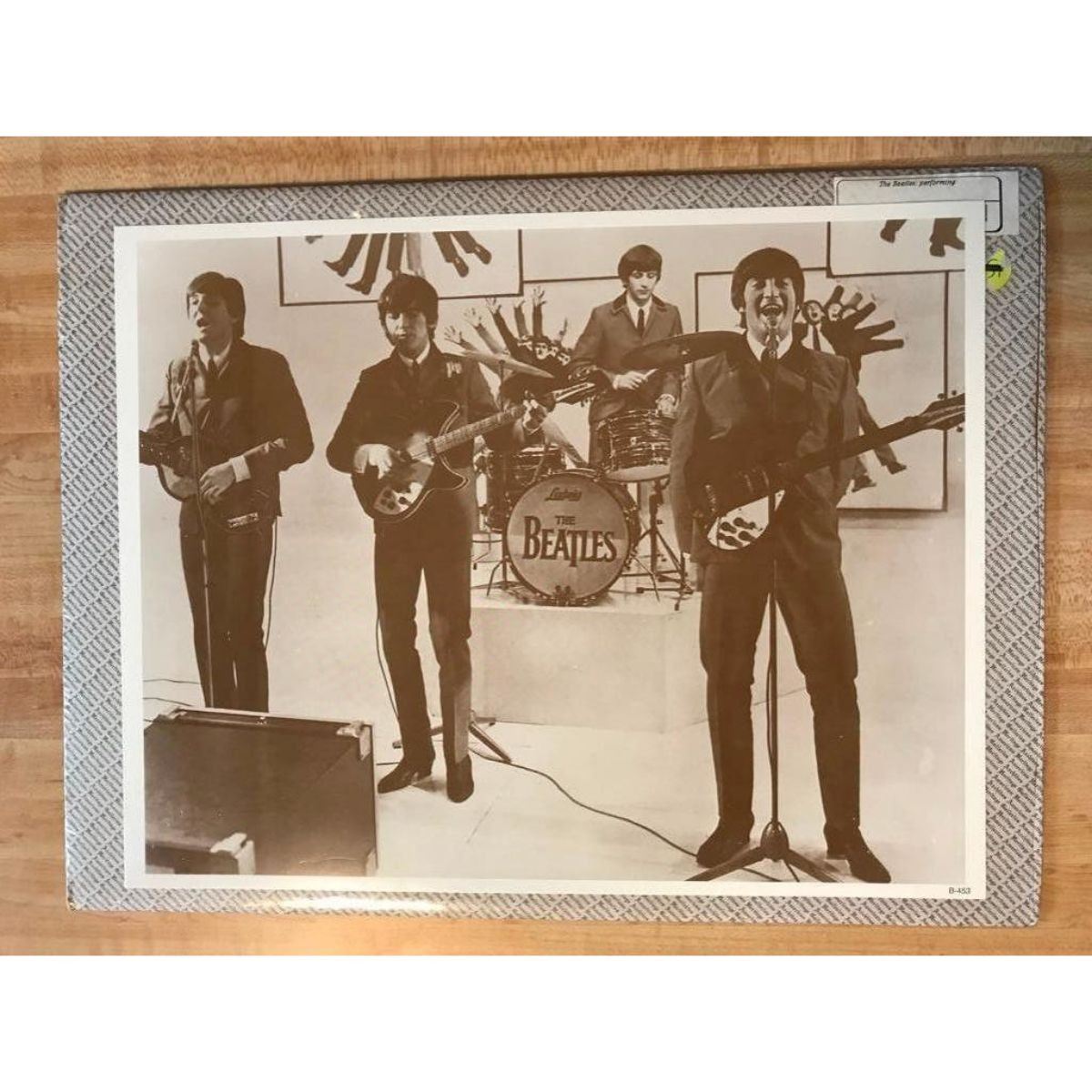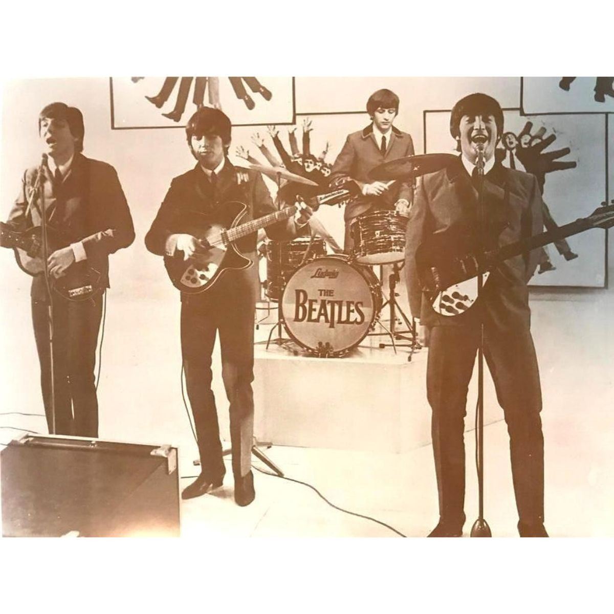 The Beatles Performing, 1960's. Sepia tone photo print, on card stock. Vintage printing from the early 1990's, in original packaging from The American Heritage Gallery. 11" X 14".Â