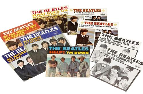 Nine full color sleeves from the original Capitol issues. Includes: Yesterday/Act Naturally (2) We Can Work It Out/Day Tripper, Nowhere Man/What Goes On, I Want To Hold Your Hand/I Saw Her Standing There (2) A Hard Day’s Night/I Should Have Known Better (2) Help/I’m Down. VG/EX. Some of the sleeves have light to medium wear.