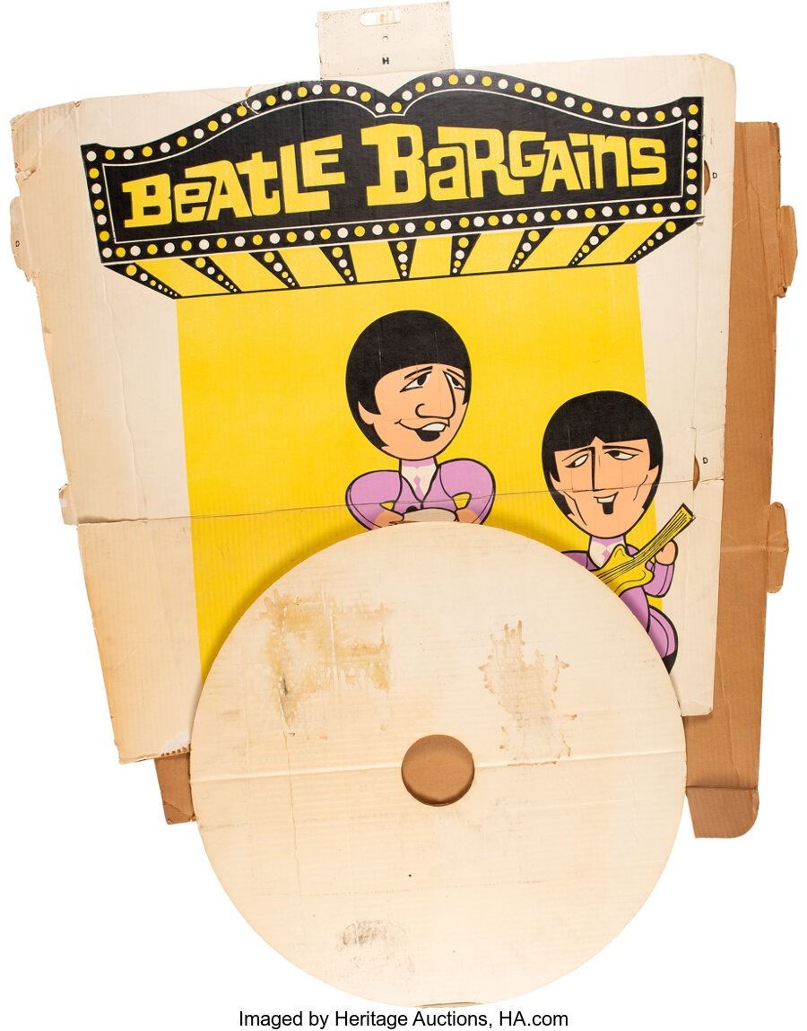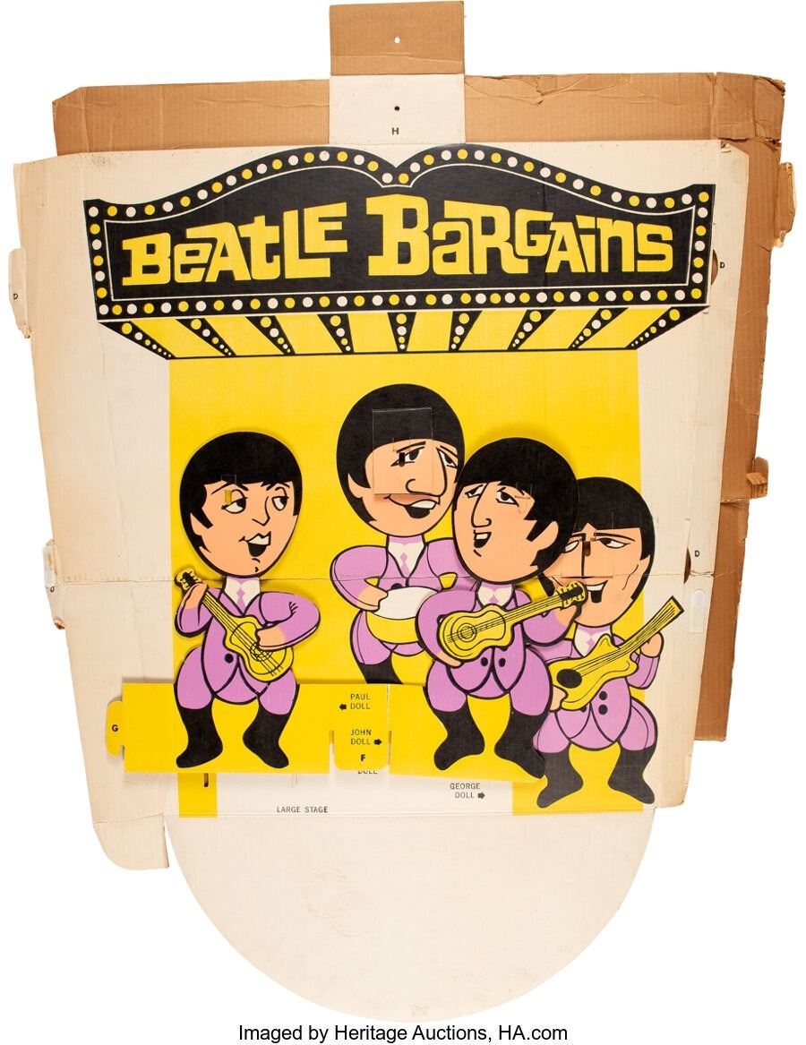 The Beatles Rare Cardboard Top Section of Store Display For Lux Soap/Inflatable Dolls Promotion (1967).Another incredibly rare item, as most of these were destroyed and thrown away. A folded carboard top section of the motion display made in conjunction with Lux Soap for inflatable Beatles dolls done in the vein of their animated cartoon. These were sent to retailers and not many survived. Measures approx. 33" x 45" when laid flat. In Fair to Good condition with overall wear, water damage, creasing, and tears. This is the only one we have ever seen so add this rare piece to the collection. COA from Heritage Auctions.