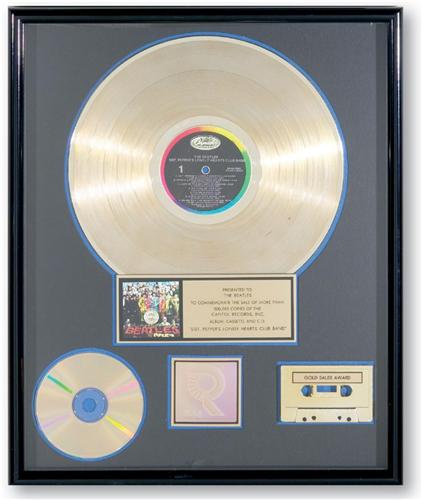1990’s. Without any questions; the number 1 rock n’ roll album of all time. Released 6/67 and certified gold on 6/15/67. It spent 15 weeks at #1 and 63 weeks on the top 40. It also won 4 Grammy’s including “Album of the Year”. This RIAA hologram award was “Presented to The Beatles”. A nice example if you can’t find the “white matte” version! 17 x 21”. NM.