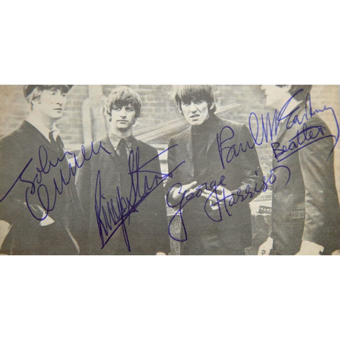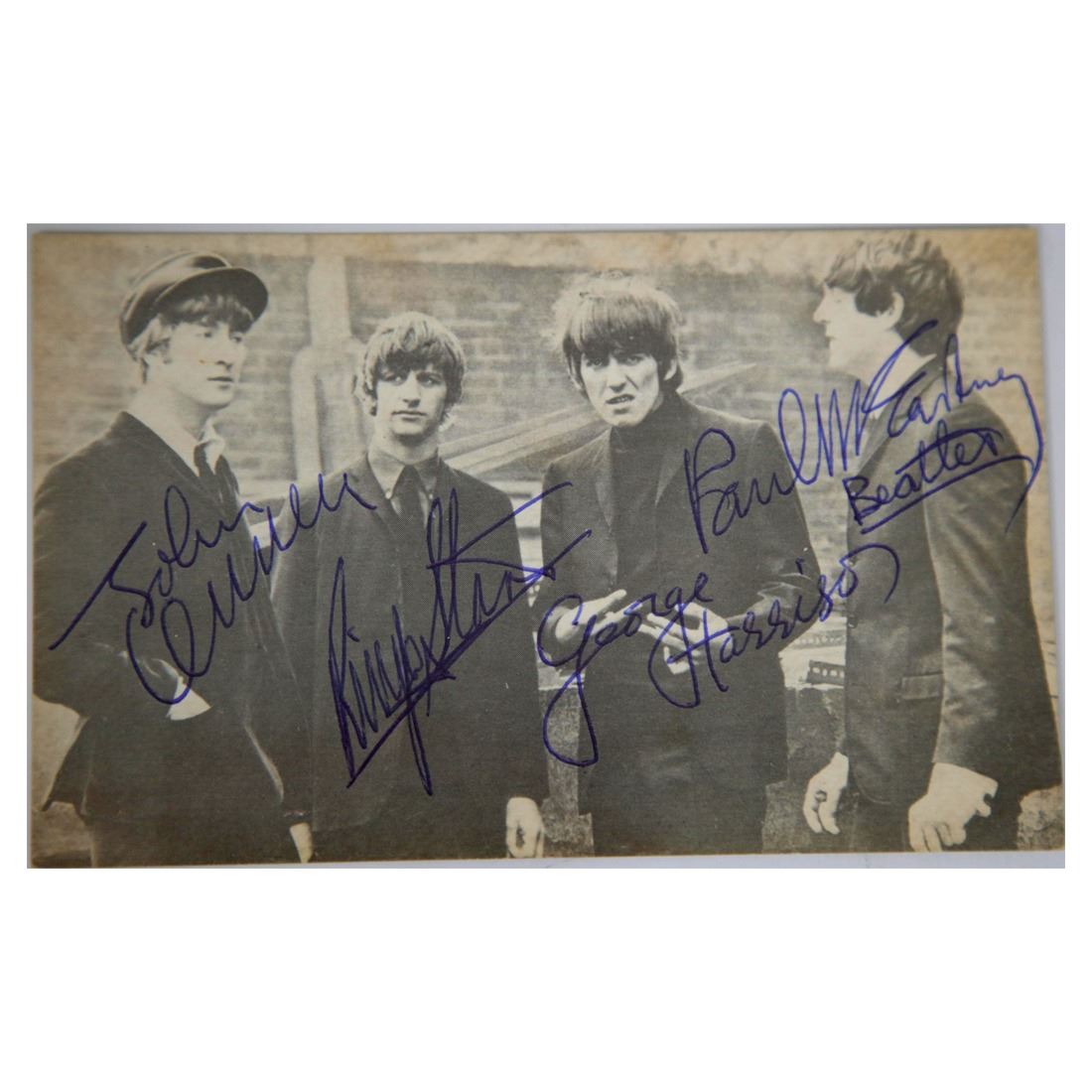 The Beatles (1960-1970) signed 3.25 X 5.25 Black and White Photo Postcard. John Lennon, Paul McCartney, George Harrison and Ringo Starr signed in blue ink; all four signatures are boldly signed. The autographed postcard is clear, crisp with no blemishes or tears. The Beatles were John Lennon, Paul McCartney, George Harrison, and Ringo Starr. One of the most successful and influential band in the history of popular music. The group were a main part of the creation of1960s counterculture. They began as a skiffle and beat band and were influenced by 1950s American rock and roll. They later used parts of classical music and Indian music. Their main songwriters were Lennon and McCartney. Before The Beatles became popular, they played in clubs in Liverpool and Hamburg over three years between 1960 and 1963, with Stuart Sutcliffe playing bass. They went through many drummers, including Pete Best, before finally asking Ringo Starr to join in1962. Sutcliffe also quit, meaning Paul McCartney started playing the bass instead. Brian Epstein was their manager and George Martin produced most of their music. Their first single was "Love Me Do", in late 1962. It was a hit, and they became popular in the United Kingdom. As they became more popular, the press called the popularity "Beatlemania". By 1964, the Beatles were worldwide stars and led the "British Invasion" of the United States. They brought out some of the best-selling albums of the 1960s, with twelve studio albums. They broke-up in 1970. John Lennon was later murdered in New York City in 1980 and George Harrison died of lung cancer in 2001. McCartney and Starr still make music. Comes with a Letter of Authentication from Guaranteed Forensic Authenticators (GFA), along with the GFA guarantee of authenticity.