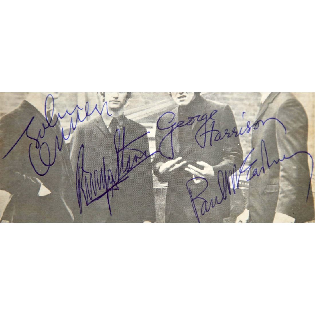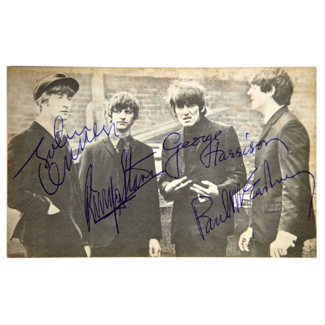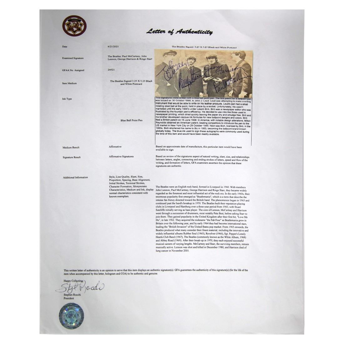 The Beatles (1960-1970) signed 3.25 X 5.25 Black and White Photo Postcard. John Lennon, Paul McCartney, George Harrison and Ringo Starr signed in blue ink; all four signatures are boldly signed. The autographed postcard is clear, crisp with no blemishes or tears. The Beatles were John Lennon, Paul McCartney, George Harrison, and Ringo Starr. One of the most successful and influential band in the history of popular music. The group were a main part of the creation of1960s counterculture. They began as a skiffle and beat band and were influenced by 1950s American rock and roll. They later used parts of classical music and Indian music. Their main songwriters were Lennon and McCartney. Before The Beatles became popular, they played in clubs in Liverpool and Hamburg over three years between 1960 and 1963, with Stuart Sutcliffe playing bass. They went through many drummers, including Pete Best, before finally asking Ringo Starr to join in1962. Sutcliffe also quit, meaning Paul McCartney started playing the bass instead. Brian Epstein was their manager and George Martin produced most of their music. Their first single was "Love Me Do", in late 1962. It was a hit, and they became popular in the United Kingdom. As they became more popular, the press called the popularity "Beatlemania". By 1964, the Beatles were worldwide stars and led the "British Invasion" of the United States. They brought out some of the best-selling albums of the 1960s, with twelve studio albums. They broke-up in 1970. John Lennon was later murdered in New York City in 1980 and George Harrison died of lung cancer in 2001. McCartney and Starr still make music. Comes with a Letter of Authentication from Guaranteed Forensic Authenticators (GFA), along with the GFA guarantee of authenticity.