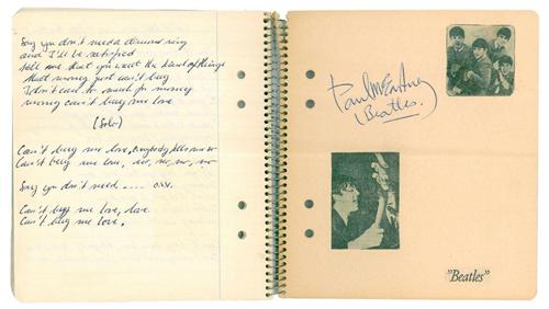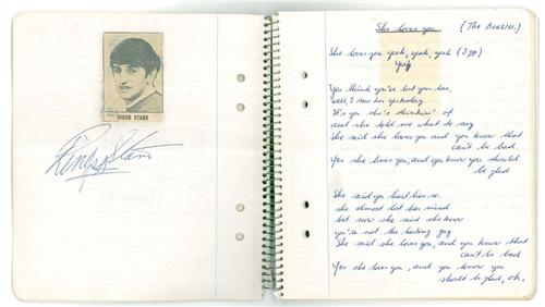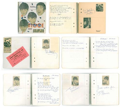 In October of 1963, The Beatles expanded their international horizons and made their way to Sweden for what would be the band’s first European tour outside of the U. K. Beatlemania quickly grabbed hold in Sweden as the band made their way through an 8-day, 5-show tour of the country. A media intensive trip, the band made numerous appearances on Swedish television and radio, and was also scheduled for a variety of interviews, including a sit-down interview for Sweden’s highly popular Expressen newspaper. On the evening of October 26, 1963, The Beatles sat down with accomplished Swedish journalist Lars Widding to fulfill the interview obligation with the Expressen newspaper. Widding, the father of a teenage daughter who joined the droves of countless Swedish teenagers in the madness of Beatlemania, decided to bring his daughter along for the evening so that she could attend the concert and also have an opportunity to meet the group. As many did during the time, Widding’s daughter had created an homage to the group in the form of a handwritten lyric book, accented by a variety of vintage newspaper clippings of the Beatles’ images along the front and back covers. At her memorable meeting with the Fab Four during her father’s interview session, Widding’s daughter presented her lyric book to the band in hopes of getting them to sign the inside. Not only did the group sign the inside, but all four were apparently quite amused by the creation and took time to browse through the book before handing it back to young Ms. Widding at the end of the interview. Presented here in this lot is Ms. Widding’s book, completely intact in its original form, beautifully signed by the Beatles on the first two pages: “Paul McCartney,” “John Lennon,” (reverse side of McCartney page) “Best wishes from George Harrison” and “Ringo Starr” (reverse of Harrison page). All signatures are large and complete examples. Paul has also signed again, on the back inside cover and added “(Beatles)” and amazingly he even actually took the time to make a slight correction on one of the lines written by the teenage fan on the lyric for “P.S. I Love You”, and he corrected by writing “these few words til we’re together”. The song “P.S. I Love You” was written by Paul and John and it appears on the Beatles’ first LP on Parlophone Records entitled “Please Please Me”. Handwritten lyrics in any form are the most desirable form of Beatle writing, and a recent sale saw one lyric sheet sell in auction at $1.2 million for only 12 lines of writing, or $100,000. per line!
