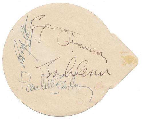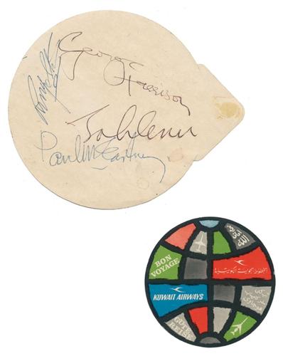 A round Kuwait Airlines luggage tag which has been signed by The Beatles, with John Lennon and George Harrison signing in