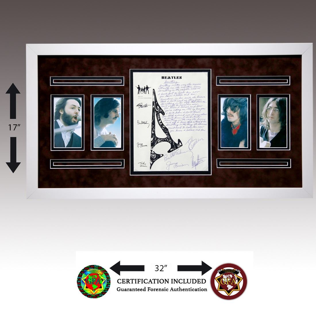 "Something" received the Ivor Novello Award for the "Best Song Musically and Lyrically" of 1969. By the late 1970s, it had been covered by over 150 artists, making it the second-most covered Beatles composition after "Yesterday". Shirley Bassey had a top-five UK hit with her 1970 recording, and Frank Sinatra regularly performed the song. Other artists who have covered it include Elvis Presley, Ray Charles, Booker T. & the M.G.'s, James Brown, Smokey Robinson and Johnny Rodriguez. In 1999, Broadcast Music Incorporated named "Something" as the 17th-most performed song of the twentieth century, with 5 million performances. In 2000, Mojo ranked "Something" at number 14 in the magazine's list of "The 100 Greatest Songs of All Time"; it was ranked 110th on Rolling Stone's 2021 list of "The 500 Greatest Songs of All Time". In 2002, a year after Harrison's death, McCartney and Eric Clapton performed it at the Concert for George tribute at London's Royal Albert Hall. This item has been professionally custom matted and framed. This item has been authenticated by Guaranteed Forensic Authenticators and comes with a Letter of Certification from Guaranteed Forensic Authenticators, along with the GFA guarantee of authenticity.