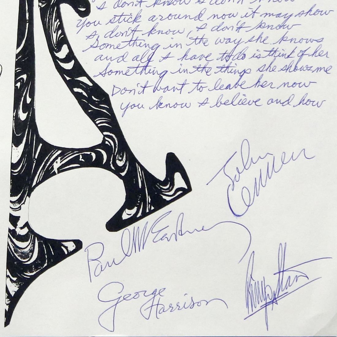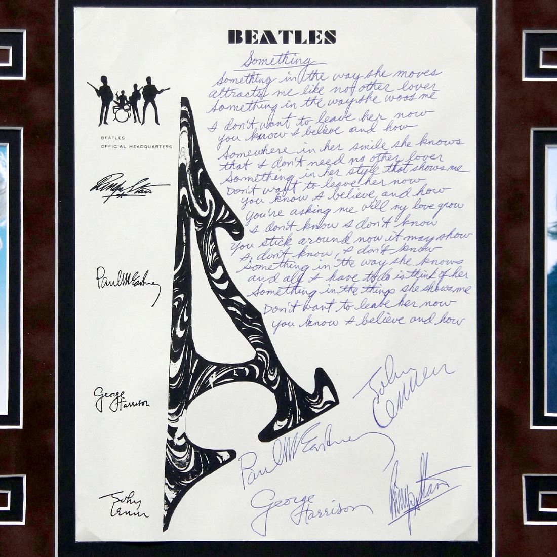 The Beatles (1960-1970) signed lyric sheet, “Something.” John Lennon, Paul McCartney, George Harrison and Ringo Starr signed, all four signatures are boldly signed and are as clear and crisp as the day they were signed. "Something" is a song by the English rock band the Beatles from their 1969 album Abbey Road. It was written by George Harrison, the band's lead guitarist. Together with his second contribution to Abbey Road, "Here Comes the Sun", it is widely viewed by music historians as having marked Harrison's ascendancy as a composer to the level of the Beatles' principal songwriters, John Lennon and Paul McCartney.[2][3] Two weeks after the album's release, the song was issued on a double A-side single, coupled with "Come Together", making it the first Harrison composition to become a Beatles A-side. The pairing was also the first time in the United Kingdom that the Beatles issued a single containing tracks already available on an album. While the single's commercial performance was lessened by this, it topped the Billboard Hot 100 in the United States as well as charts in Australia, Canada, New Zealand and West Germany, and peaked at number 4 in the UK.