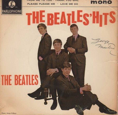 An original Parlophone 7 inch single The Beatles Hits , From Me to You ~ Thank You Girl ~ please Please Me and Love Me do Mono 45 R.P.M. extended Play GEP 8880 by Northern songs limited recording first published 1963 serial number 7TCE ~ 760 ~ 2N and this has been signed by the late George Martin to the front of the record sleeve to the outer right hand signed and this is a very good signature on a good record and now a very scarce signature.
