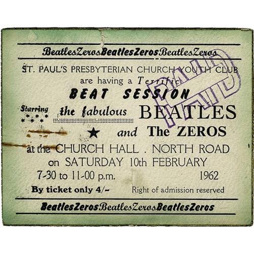 <B>The Beatles/The Zeros Concert Ticket.</B></I> For the February 10, 1962 "Beat Session" featuring the Beatles and the Zeros at the St. Paul's Presbyterian Church Hall, one of the earliest gigs booked by Brian Epstein. In Very Good condition with a very small tear near the top edge, mild staining and wear to the edges and corners, and handwriting on the back.