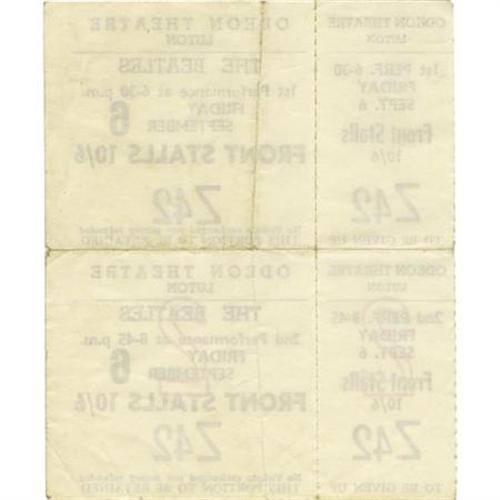 <B>The Beatles Unused Ticket to 1963 Performance at the Odeon.</B></I> A supercool unused ticket to both of the Beatles' performances on the evening of September 6, 1963 at the Odeon Theatre in Bedfordshire. In Fine to Very Fine condition with some mild wrinkling and fold creases.<BR><BR><b>Shipping:</b> Flat Material, Small (<a target="_blank" href="http://www.heritageauctions.com/common/shipping.php">view shipping information</a>)