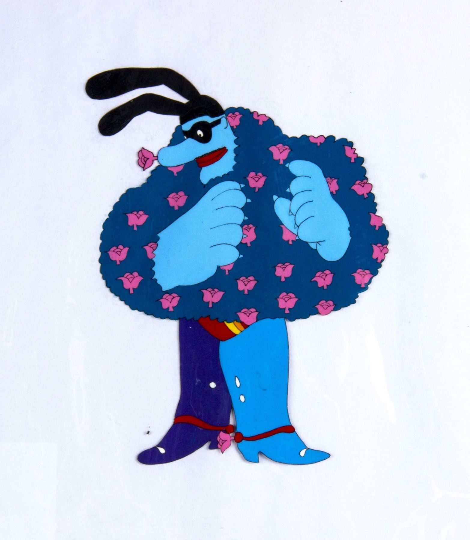 (King Features, 1968) An original hand-painted animation cel used in the production of The Beatles film "Yellow Submarine". The cel features the Chief Blue Meanie in a fantastic full-body pose with roses sprouting from his body. The image size is 6.5"x5" and the untrimmed cel good with some wear throughout the cel sheet, including discoloration in the top-left corner and some cloudiness to areas of the cel.