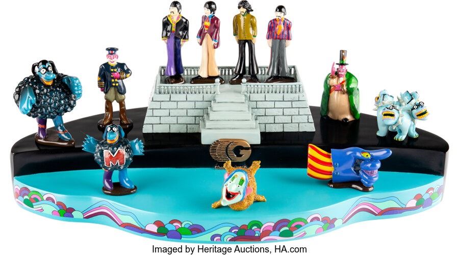 The BeatlesYellow SubmarineMaster Collection 11 Figurines Plus Display Stage (Gartlan, 1999).Wow! You do not see these anymore. A complete matched and numbered set of eleven hand-painted cold cast porcelain figurines in a limited edition issued by Gartlan USA 1999 Suba Films, Ltd. Each is marked w/matching #37 Low Number of 10,000 made. Figurines measure up to approx: 4" tall and include all four Beatles, Blue Meanie, Lord Mayor, Captain Fred, Bulldog, Flying Glove, Jeremy, and Max. Figurines were sculpted by Michael Pascucci. The master collection comes with a promotional resin base display stage measuring approx: 10" by 18.75".