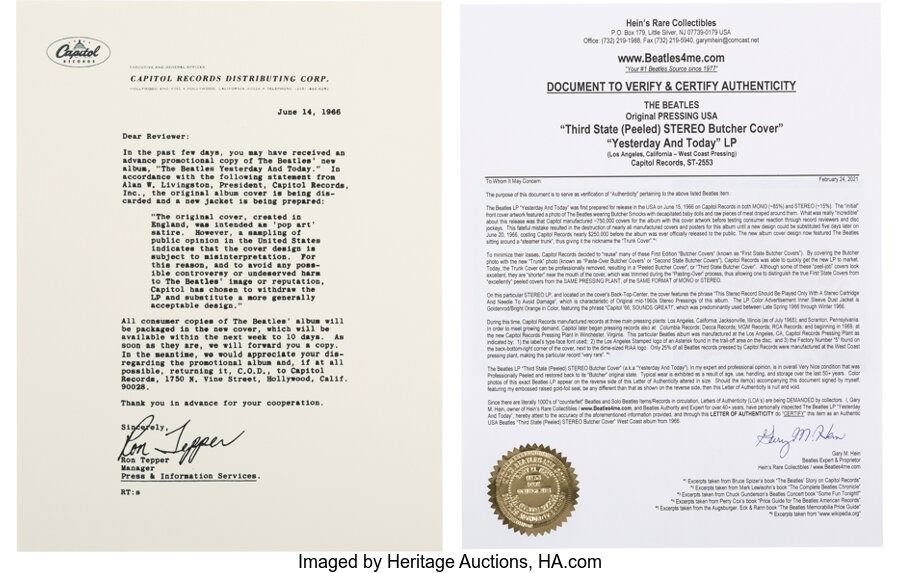 This is a one-off opportunity to add this spectacular example to the collection! Condition: Jacket EX-7 / Disc NM/ Trunk cover slick GD-3. LOA from Beatles Authority Gary M. Hein of Hein's Rare Collectibles and COA from Heritage Auctions.