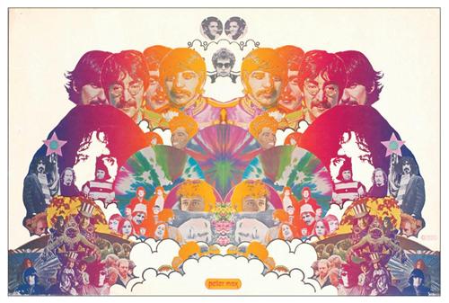 1967. This spectacular and freak-o-delic poster is one of Peter Max’s most exciting collages. Max incorporates The Beatles, Jefferson Airplane, Frank Zappa & The Mothers of Invention, The Mamas and the Papas, Grateful Dead, James Brown, Elvis Presley, Bob Dylan and Donovan into this work, titled “Audio D.N.A.” This poster has been mounted on cardboard. This is one of the hardest to find Peter Max posters. 24 x 36”. VG+. with a few tiny tack holes on the four corners and two corner tip dents. Some mild edge wear on the bottom edge.