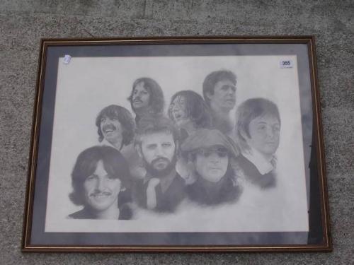 The Beatles glass framed 22"x28" charcoal drawing of group members by Chaplan
