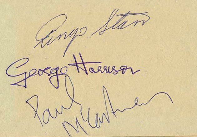 7x5 inch vintage autograph book page signed by Paul McCartney, George Harrison and Ringo Starr, missing John Lennon's autograph. Supplied with coa.