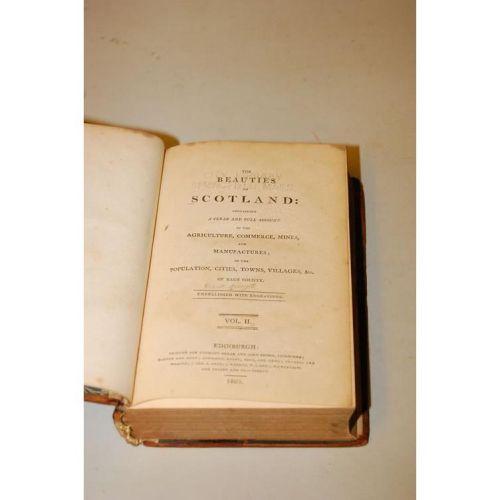 The Beauties of Scotland: Containing a Clear and Full Account of the Agriculture, Commerce, Mines, and Manufactures; of the Population, Cities, Towns, Villages, of Each County - 4 Volumes. Edinburgh: Printed for Thomson Bonar and John Brown...., 8vo - over 7¾" - 9¾" tall. Hard Cover. Ex-Library. Good Condition. Volumes II - V. 1805-1808. Leather bindings, marbled endpapers, library cloth over backstrips, covers detached on vol. V. Each volume has additional engraved title pages. With 89 engraved plates (most with tissue guards). Bindings tight. Covers worn, occasional foxing.