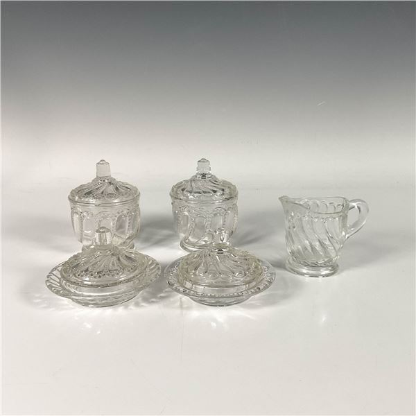 Twist patterned set includes two butter plates with lids, two sugar bowls with lids, and a creamer. Butter plate with lid: 3.5"W x 2.25"H....