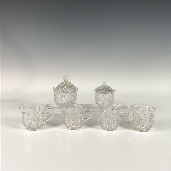 Glassware set adorned with intricate various patterns including diamonds and flowers includes two sugar bowls with lids, two creamers, and two spooner