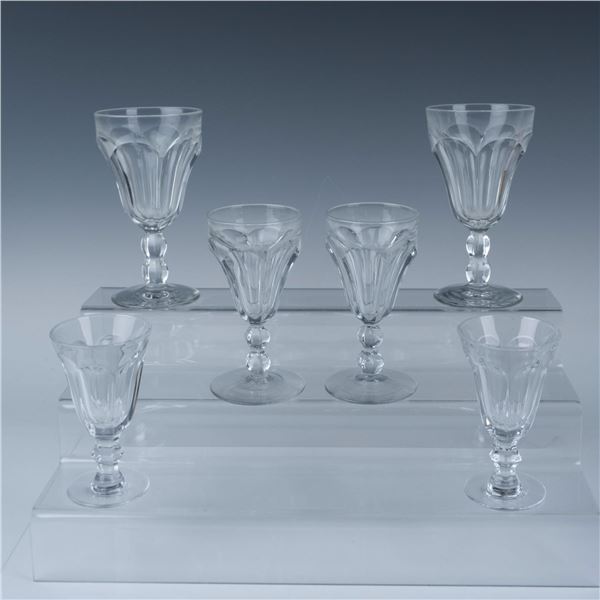 A set of 6 clear goblets designed with arch shaped cuts on their bowls, featuring a rounded stem and flat base, and a flat rim in three different size