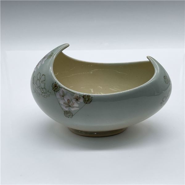 An antique crescent-shaped bowl in a pale blue and tan glaze. Adorned with hand painted white apple blossom flowers. Rookwood two flames impressed sta