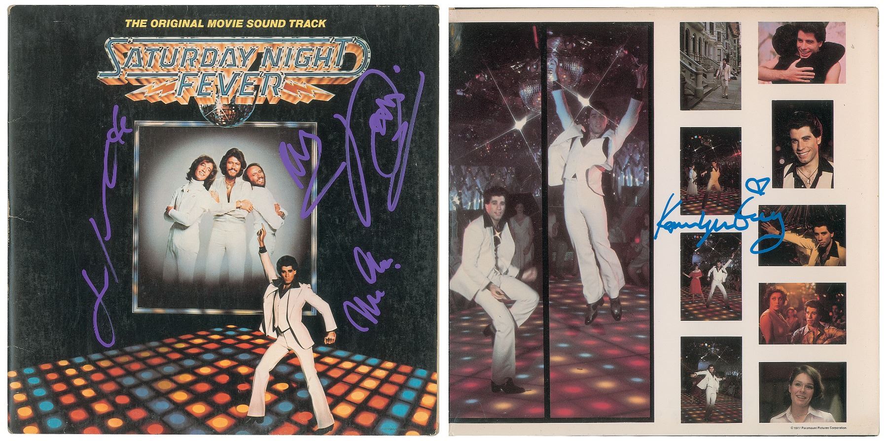 Saturday Night Fever movie soundtrack album signed on the front cover in purple paint pen by Barry, Robin, and Maurice Gibb, and John Travolta, with inner gatefold signed in blue paint pen by Karen Lynn Gorney. In fine condition, with some light edge wear. The record is included.