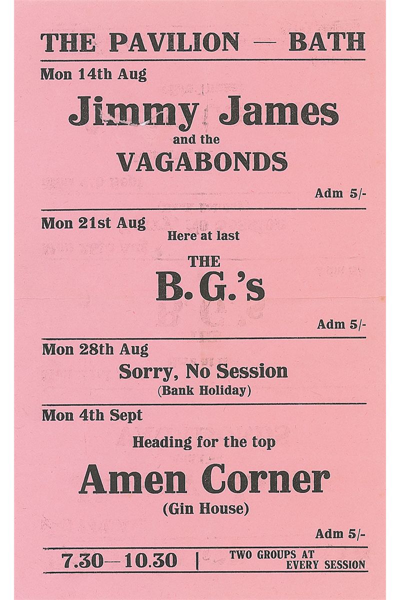 Original handbill from The Pavilion in Bath, England, 5 x 8, for a Bee Gees performance on August 21, 1967. Also on the bill are Jimmy James and Amen Corner. In very good condition, with small tear near top, central horizontal and vertical fold, and scattered creasing. Accompanied by a certificate of authenticity from Tracks.