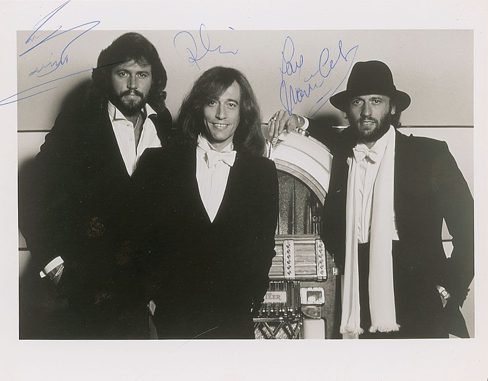 Glossy 10 x 8 photo of the brothers Gibb posing next to a juke box, signed in blue ballpoint by Barry, Robin, and Maurice Gibb, with Barry and Robin signing first name only. In fine condition. Accompanied by a letter of authenticity from James Spence.