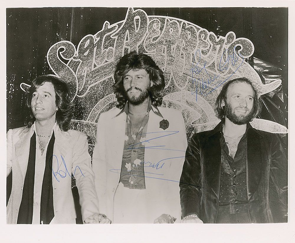Glossy 10 x 8 photo of the Bee Gees at a Sgt. Pepper event, signed in blue ballpoint, “Robin,” “Barry,” and “Love, Maurice Gibb.” In fine condition, with a few dings to right edge.