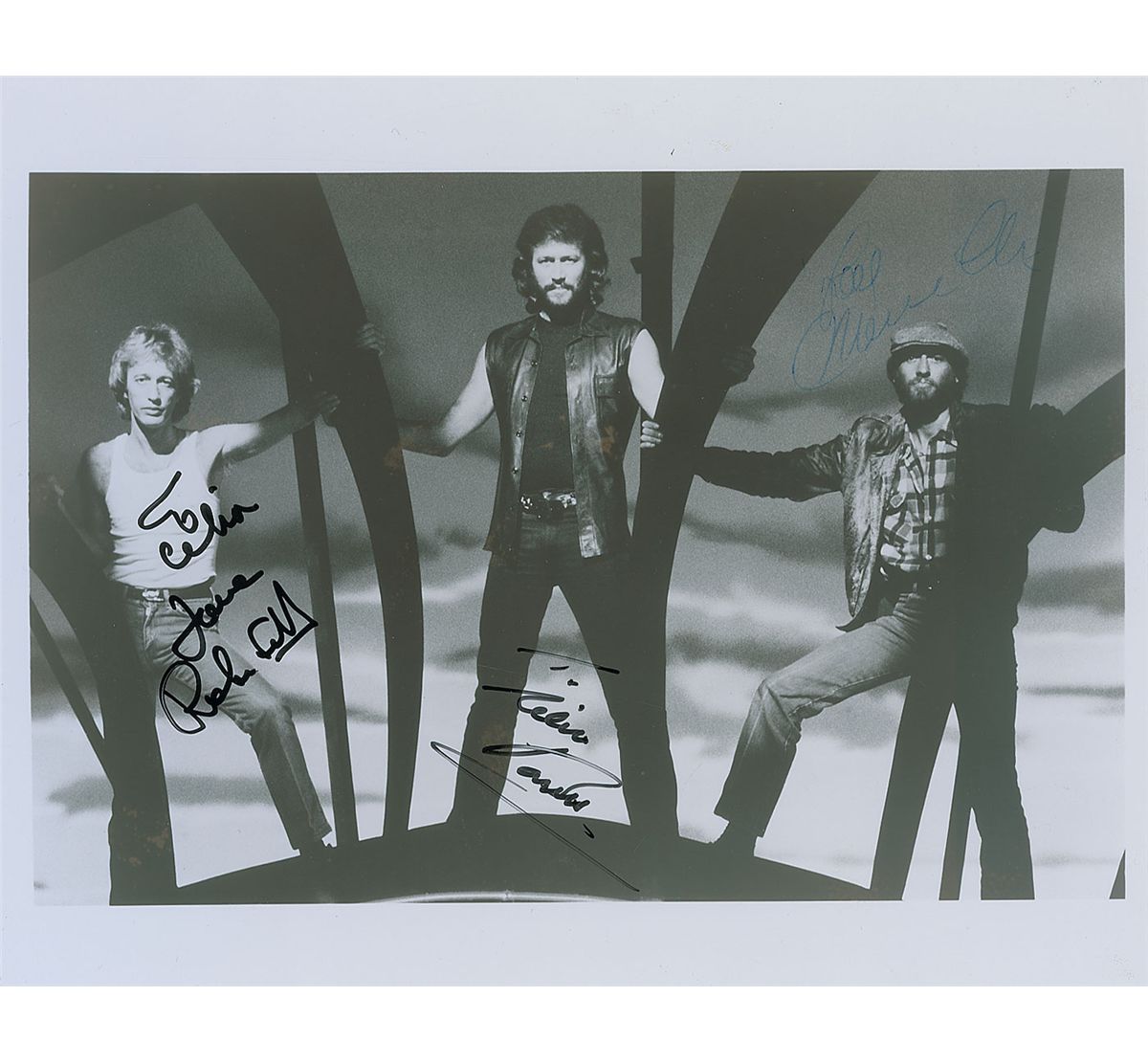 Glossy 10 x 8 group photo, signed and inscribed in black felt tip, “To Celia, Love, Robin Gibb,” “To Celia, Barry,” and signed in blue ballpoint, “Love, Maurice Gibb.” In fine condition.