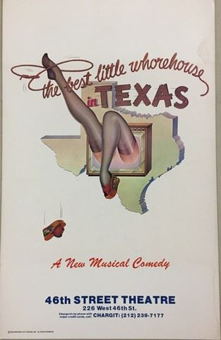 The Best Little Whorehouse in Texas (ca. 1978). Broadway Show Window card. This staged presentation was presented at the 46th Street Theatre. The poster is inside of a hard plastic cover that’s ideal for mounting on wall. There are creases, stains, holes and edge wear damage to the poster and the cover. Fine. (14" X 22").