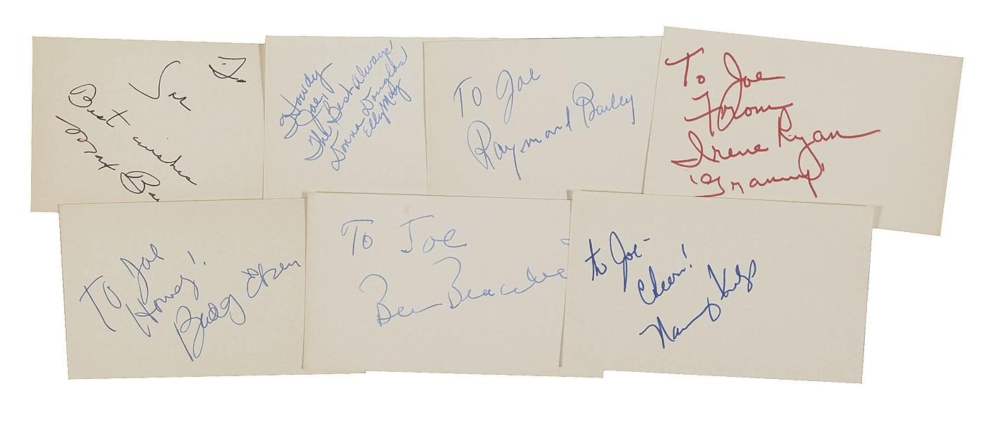 In-person ink and felt tip signatures and inscriptions of Irene Ryan, Buddy Ebsen, Donna Douglas, Max Baer, Nancy Kulp, Raymond Bailey, and Bea Benaderet on individual off-white 5 x 3 cards. Ryan and Douglas have also added their character names. In fine condition.