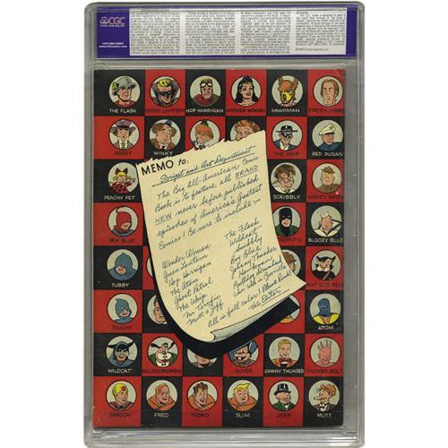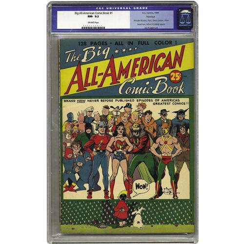 <B>The Big All-American Comic Book #1 Hawkeye pedigree (DC, 1944) CGC NM- 9.2 Off-white pages.</B></I> A square bound comic that has 128 pages and is over 60 years old would almost never be found in top condition, so a NM- copy is quite a treat indeed. Boy, did this giant issue offer kids their money's worth; just listing the characters would take us quite a while. This comic is from the days when M. C. Gaines' All-American Comics (which published <B>All-Star Comics</B></I>, <B>Flash Comics</B></I>, and <B>Sensation Comics</B></I>) was essentially a separate branch of DC (home of <B>Detective Comics</B></I>, <B>Action Comics</B></I>, and more). We believe every significant All-American Comics character is present in this book, not only top superheroes like Flash, Wonder Woman, and Green Lantern (and just about every other Justice Society member too), but humor standbys like Mutt and Jeff, and Sheldon Mayer's Scribbly. The list of artists is pretty impressive, too, including Joe Kubert, E. E. Hibbard, Sheldon Mayer, and others. By the way, it's a significant comic in Kubert's career, as it's the very first time the artist worked on Hawkman. Also, some refer to this as the first DC annual. Interest in the book is mounting -- it was added to Overstreet's list of the 100 most valuable Golden Age books last year, and has retained that status this year. Overstreet 2006 NM- 9.2 value = $15,300. CGC census 03/06: 1 in 9.2, 1 higher.