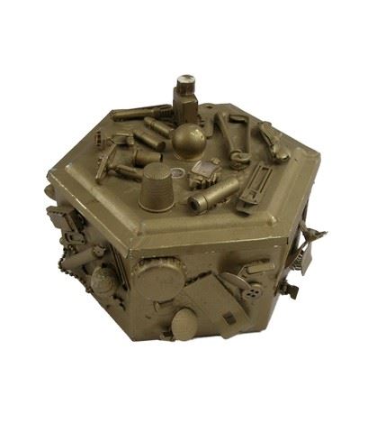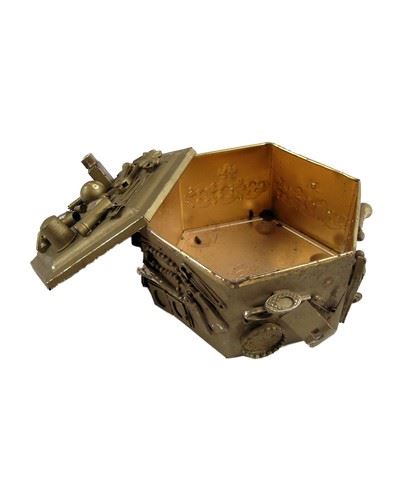 Direct from the set of the ever popular hit TV series The Big Bang Theory (2007 - Current) is this very unique bronze painted box with multiple items attached. Measures approximately 7" diameter.